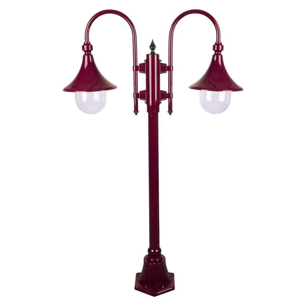 Monaco Burgundy 2 light die-cast aluminium and moulded acrylic lens twin head 1.35m post light. Made in Italy, assembled and powder coated in Australia. Also available in Black, Beige, Green & White. Requires 2 x E27 globes.