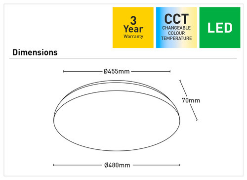 With a compact, low-profile form factor measuring 480mm in diameter and 70mm in height, the fitting is designed for unobtrusive ceiling integration in spaces with standard ceiling heights. The combination of an iron base and PMMA diffuser provides a stable mechanical structure and uniform light diffusion, contributing to reduced glare and even luminance distribution across the illuminated area. The non-dimmable electrical configuration ensures stable operation within standard switching circuits.