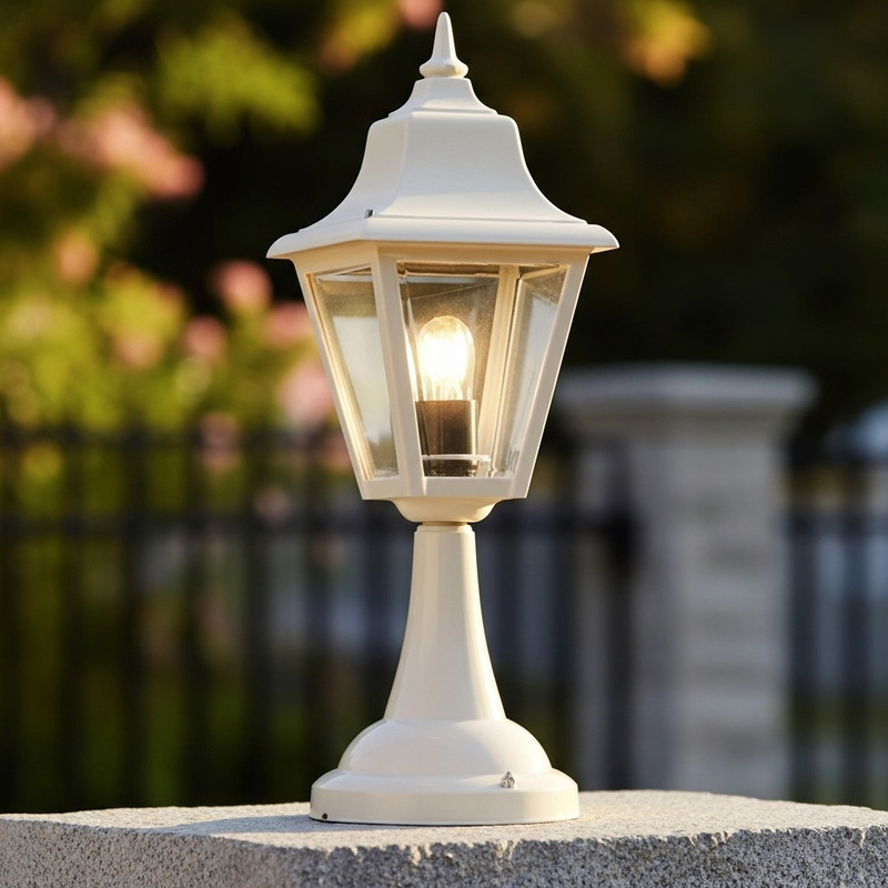 Beige single light pillar mount, die-cast aluminium body and moulded acrylic lens. Made in Italy, assembled and powder coated in Australia. This pillar mount light can be mounted on a wall or pillar (or on any fixed surface).