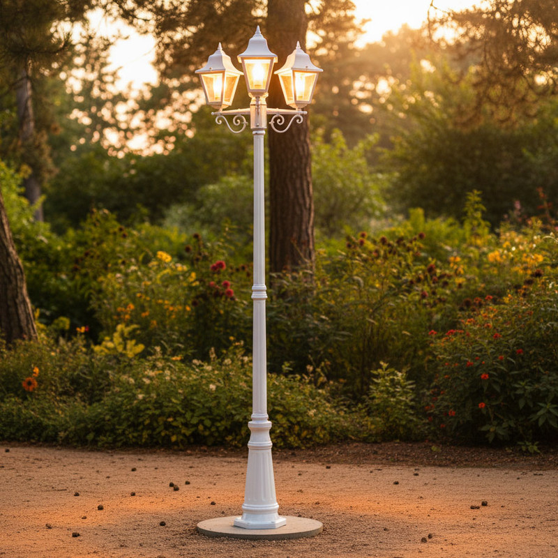 Paris White 3 light 2.45m post light, die-cast aluminium body and moulded acrylic lens. Made in Italy, assembled and powder coated in Australia. Also available in Black, Burgundy, Green & Beige. Requires 3 x B22 globes.