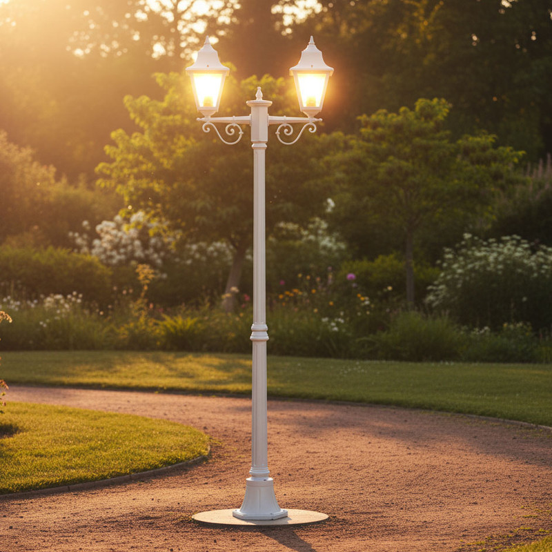 Paris Beige 2 light 2.09m post light, die-cast aluminium body and moulded acrylic lens. Made in Italy, assembled and powder coated in Australia. Also available in Black, Burgundy, Green & White. Requires 2 x B22 globes.