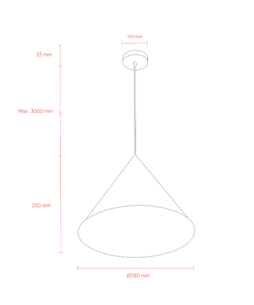 With a body dimension of 280mm in diameter and 250mm in height, this pendant light is designed to offer a clearly defined light footprint without overwhelming the surrounding space. The adjustable suspension, extending up to 3000mm, allows precise control of the installation height to suit varying ceiling heights and spatial layouts. A discreet ceiling canopy measuring 120mm in diameter and 25mm in height provides a clean ceiling interface, supporting a visually balanced and professional installation outcome.