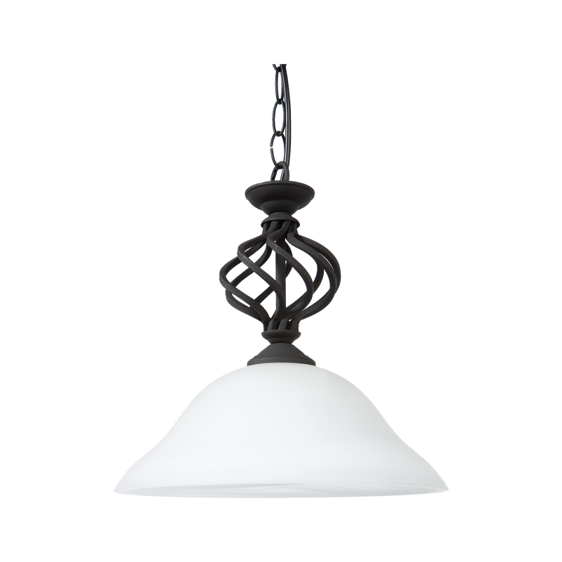 This pendant light is a refined decorative luminaire designed to deliver reliable ambient illumination while providing a strong visual presence within indoor residential environments. Finished in a black tone, the fitting incorporates a pressed alabaster glass shade that softly diffuses light, creating a balanced and comfortable illumination profile. The combination of iron metalware and glass construction ensures structural stability while maintaining a timeless aesthetic suited to both classic and transitional interior schemes.