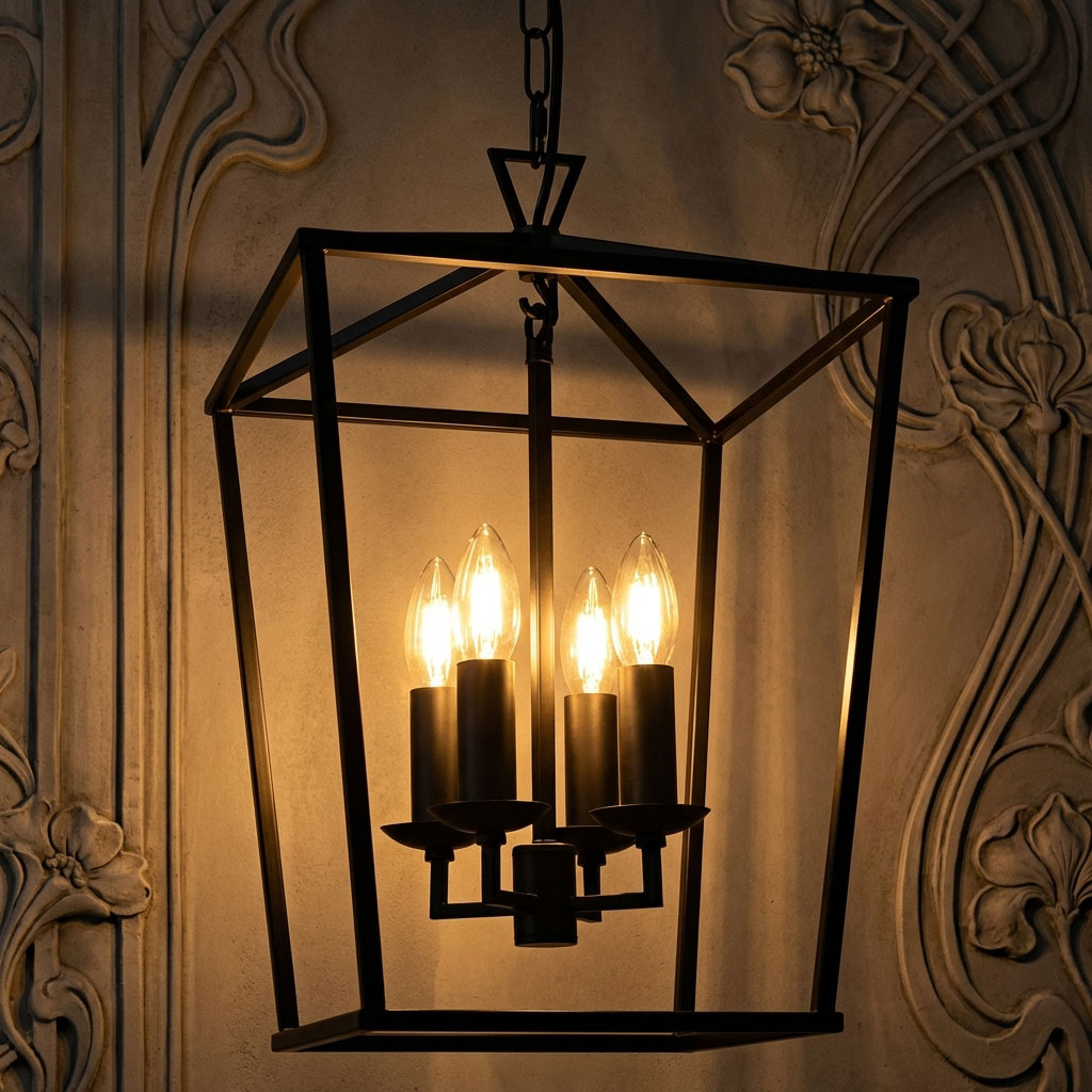 Designed with a robust metal construction, this pendant light ensures long-term durability and structural stability while maintaining a refined decorative appearance. The lantern-inspired frame encloses 4 light sources arranged to create even light distribution throughout the surrounding space. This multi-light configuration enhances brightness while producing a visually layered illumination effect.