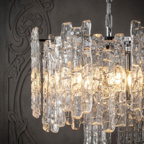 This pendant light is a sophisticated decorative lighting fixture designed to deliver both functional illumination and refined visual appeal in residential interiors. Featuring a luxurious chrome and clear finish combination, the fitting integrates a durable metal framework with textured glass elements that enhance the diffusion of light. The layered glass structure creates depth and visual complexity while allowing illumination to pass through the glass surfaces with clarity. With a diameter of 430mm and a height of 365mm, the fixture forms a distinctive focal point that complements dining areas, living spaces, and entryways where statement lighting is desired.
