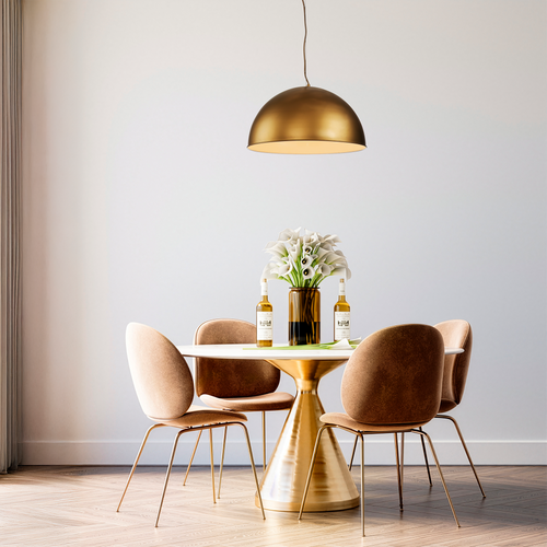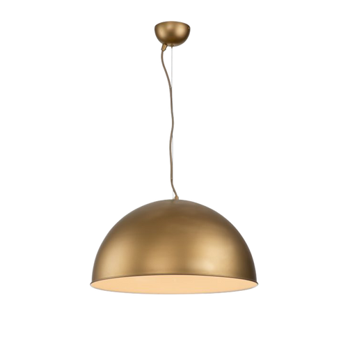 This pendant light is a refined dome-style luminaire engineered to deliver controlled downward illumination while introducing a strong decorative presence within indoor environments. Finished in a silky gold painted coating, the iron shade provides a warm metallic aesthetic that enhances both contemporary and industrial interior schemes. The smooth hemispherical profile ensures even light distribution across benchtops, dining surfaces, and seating areas, while maintaining a clean architectural silhouette that integrates seamlessly into residential living spaces.