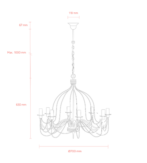 With an overall body dimension of 630mm in height and a 700mm diameter, this pendant light is proportioned to create visual impact without overwhelming the space. The adjustable chain suspension, extending up to 1000mm, allows the installation height to be precisely tailored to ceiling heights and layout requirements, supporting balanced light distribution and aesthetic alignment. A compact ceiling canopy measuring 118mm in diameter and 67mm in height ensures a clean and unobtrusive ceiling interface.