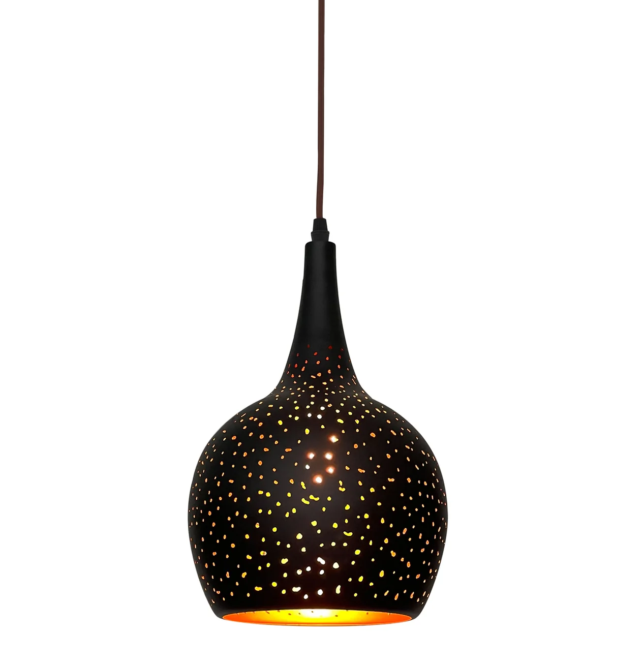 Designed for versatility, the pendant incorporates a 3000mm adjustable suspension cable that allows for precise installation at varying ceiling heights. A 100mm diameter ceiling canopy provides secure mounting while maintaining visual harmony with the fixture's proportions. The combination of black exterior and gold interior creates a distinctive luminance that adds depth and character to its illumination, making it an ideal choice for feature lighting in living rooms, dining areas, or hallways.
