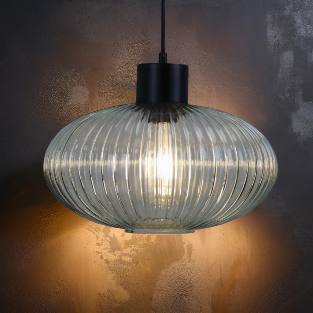 This pendant light embodies a perfect synthesis of modern design and functional precision, offering a refined illumination solution for contemporary interiors. Crafted with a striking black suspension and a meticulously formed clear glass shade, it enhances ambient lighting while maintaining a sophisticated aesthetic. The optic ribbed glass structure interacts elegantly with light sources, creating a dynamic interplay of illumination and shadow that elevates any interior setting. With its compact dimensions of 230mm in height and 300mm in diameter, this pendant light is ideal for both residential and commercial applications where space and style are equally prioritized.