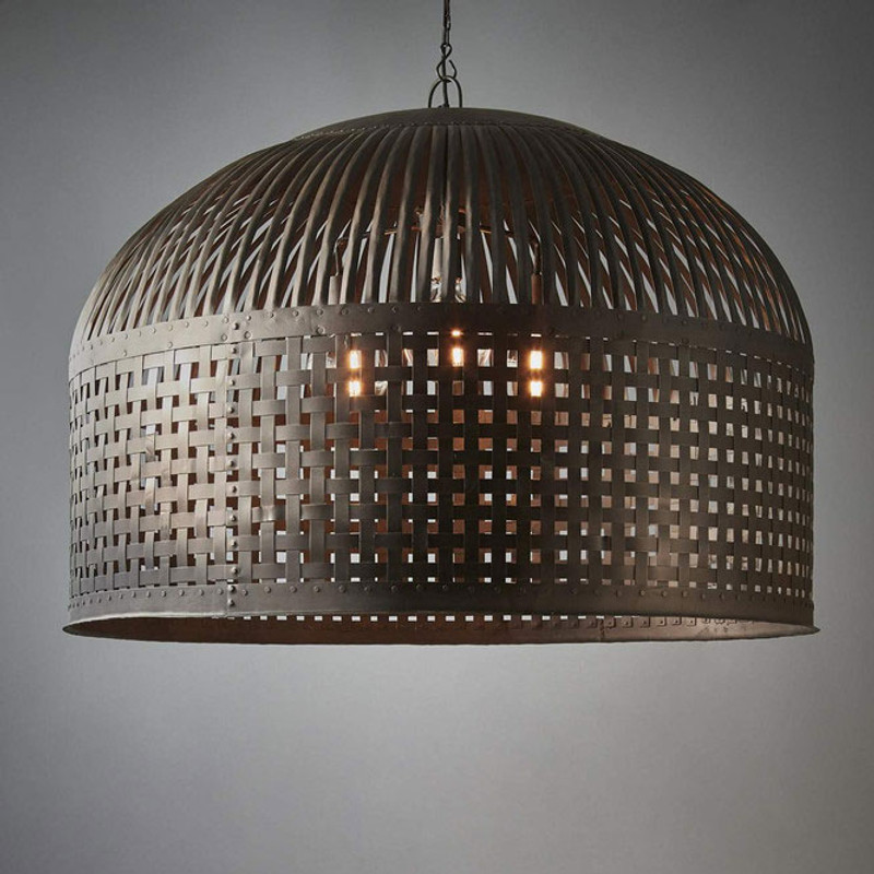 This pendant light features individual lengths of iron strips that are woven together and held in place by rivets, suspended beneath a graceful dome.