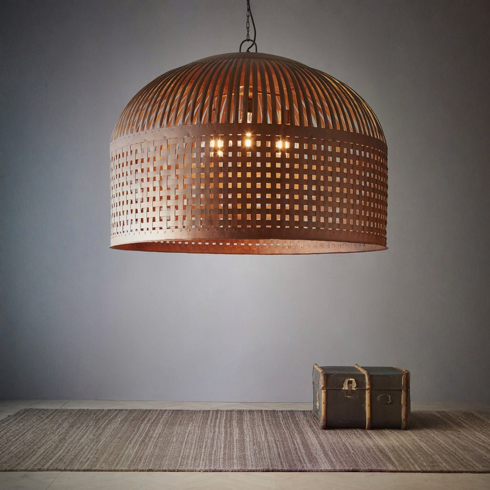 This pendant light features individual lengths of iron strips that are woven together and held in place by rivets, suspended beneath a graceful dome.