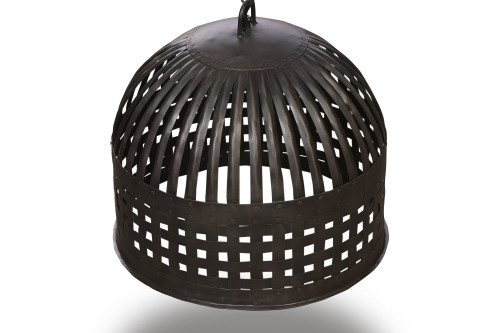 This pendant light features individual lengths of iron strips that are woven together and held in place by rivets, suspended beneath a graceful dome.