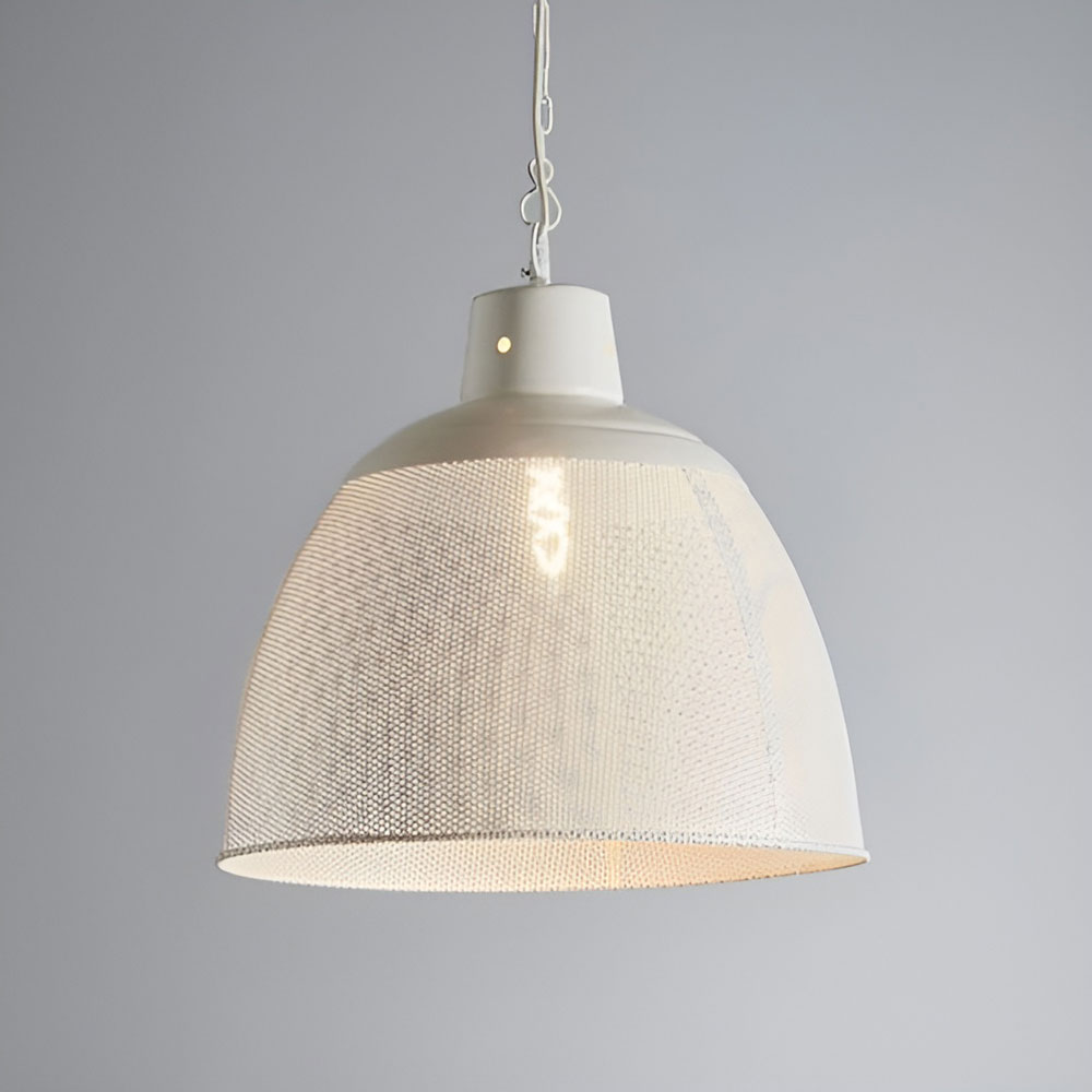 A rustic perforated pendant light with an industrial feel. It is designed to patina over time for a vintage aesthetic.