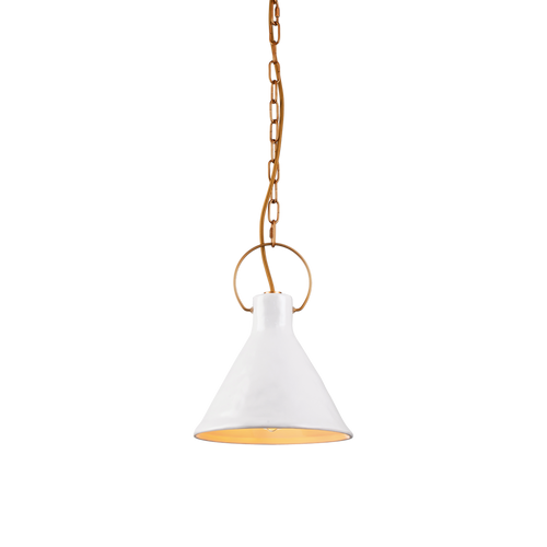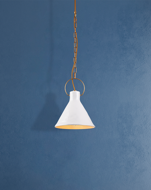 This pendant light is a refined decorative luminaire designed to deliver reliable illumination while providing a distinctive visual presence within indoor environments. The shade is finished in white, formed from glazed porcelain that presents a clean, heritage-inspired surface, while the suspension chain and metalware are finished in gold, creating a balanced two-tone contrast. This considered colour separation enhances visual clarity and allows the fitting to integrate seamlessly into both classic and transitional interior schemes.