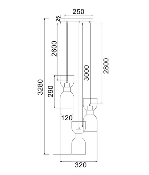 The fitting consists of three individual pendants, each measuring 320mm in cluster diameter with a 290mm shade height, suspended from a single round canopy for a unified presentation. The 3000mm adjustable cable provides versatile installation heights, while the 250mm x 25mm ceiling canopy ensures secure mounting and a clean ceiling interface. This configuration allows for precise positioning and symmetrical light distribution across various interior settings.