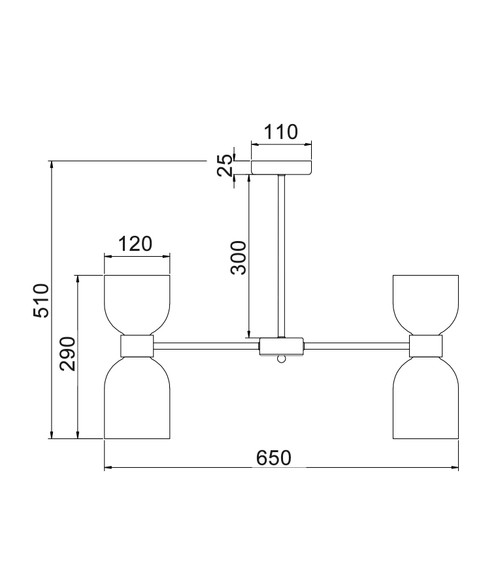 The fixture measures 650mm in diameter with a 290mm body height, offering balanced proportions suitable for a wide range of room sizes. A 300mm suspension rod provides a secure and consistent drop, while the 110mm x 25mm ceiling canopy ensures precise mounting and discreet ceiling integration. This configuration allows for optimal light distribution and symmetry while retaining a clean architectural appearance.