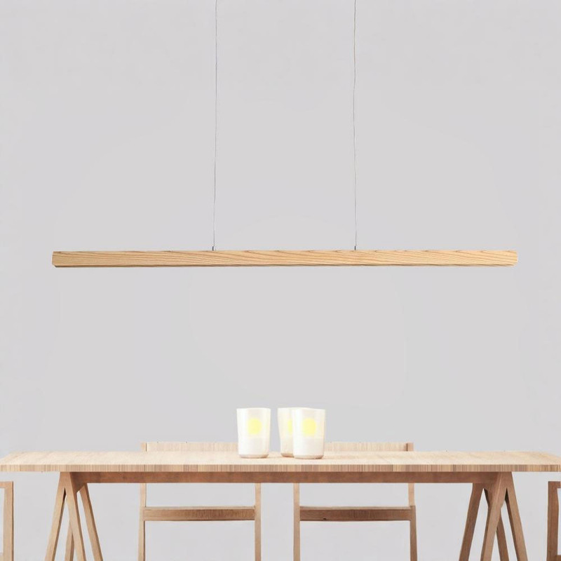 This pendant light is a refined lighting solution that combines modern linear design with the natural warmth of timber, making it ideal for enhancing contemporary interiors. Measuring an impressive 1500mm in length with a slender 40mm width and 45mm height, it delivers a sleek, unobtrusive profile that integrates seamlessly above dining tables, kitchen islands, or workspaces. The natural timber finish showcases authentic grain patterns, bringing a touch of organic texture to the space while maintaining a minimalist silhouette. Its elongated form ensures wide, even illumination across surfaces, complementing both residential and light commercial environments.