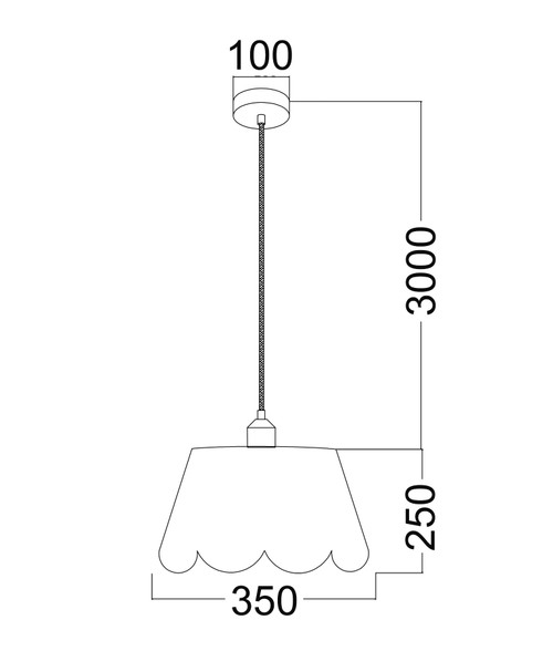 The light fitting measures 350mm in diameter with a height of 250mm, providing balanced proportions suitable for dining areas, living rooms, or hallways. Its suspension system includes a 3000mm adjustable PVC cable, allowing precise customisation of installation height to meet spatial requirements. A ceiling canopy with a 100mm diameter and 25mm height ensures secure and discreet ceiling attachment, complementing the overall minimalist design.