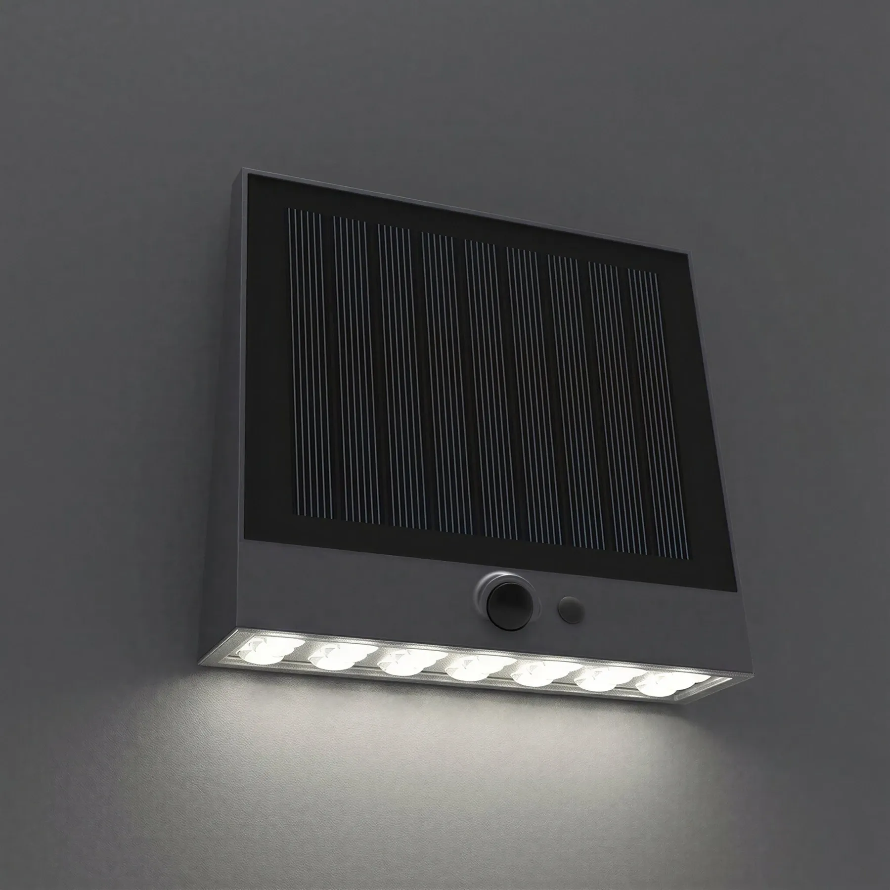 A built-in PIR motion/proximity sensor enhances operational efficiency and adaptability, offering four selectable lighting modes to suit different requirements. Mode 1 provides 25% brightness from dusk to dawn, Mode 2 delivers 10% brightness with automatic 100% output for 30 seconds upon motion detection, Mode 3 remains off until motion triggers 100% output for 30 seconds, and Mode 4 maintains continuous 100% brightness throughout the night. With a 30-second sensor timer and integrated intelligent control, this solar wall light offers a high-quality, energy-efficient solution for secure and practical outdoor illumination.