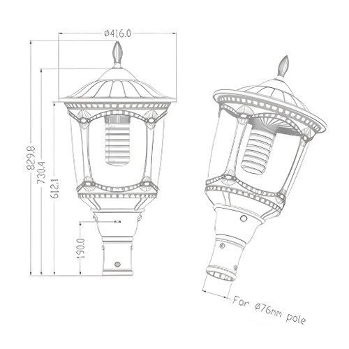 Constructed from aluminium and polycarbonate, the luminaire provides a mechanically robust enclosure designed to withstand prolonged outdoor exposure. The IP65 ingress protection rating ensures resistance to dust and water ingress, while the IK08 impact resistance classification provides enhanced protection against vandalism and mechanical shock in exposed environments. With a mounting height of 3m and compatibility with 76mm diameter posts, the fitting offers flexible integration into a wide range of outdoor lighting infrastructures, delivering a long-term, low-maintenance lighting solution supported by a two-year product warranty including the battery system.