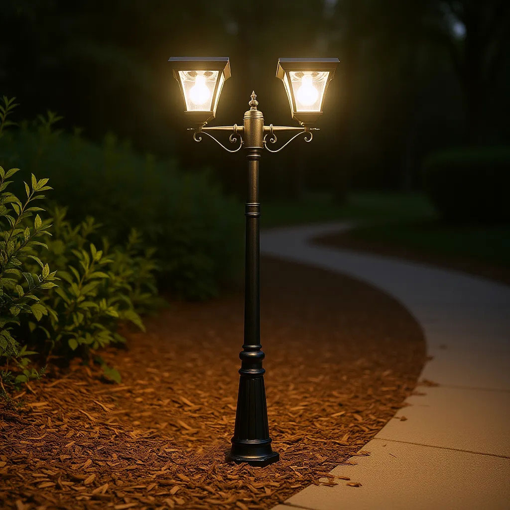 This double-headed solar post light seamlessly combines practicality with contemporary design, perfect for illuminating your outdoor areas. Ideal for driveways, parks, walkways, paths, and waterfronts, its dual-head lighting provides enhanced coverage. The stylish black aluminum alloy construction, coupled with clear glass shades, ensures both durability and an elegant aesthetic, making it a sophisticated addition to any outdoor setting.