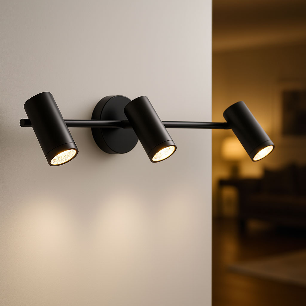 Black 3 LED spotlights each head swivels 350 degrees and tilts 90 degrees