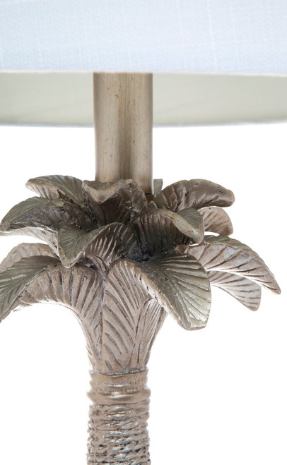 A champagne palm tree table lamp in poly resin with a white tapered drum shade.