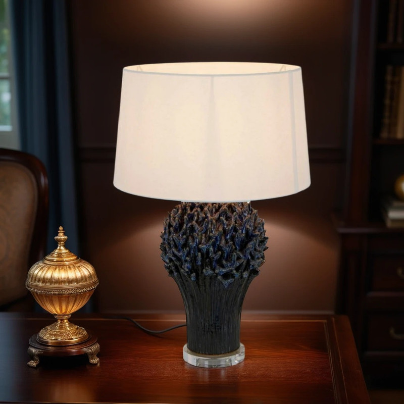 This table lamp is a distinctive lighting fixture featuring a striking blue coral ceramic base, masterfully sculpted to emulate the organic intricacies of marine flora. Its visually rich texture and deep blue glaze evoke the natural beauty of oceanic coral formations, making it an ideal accent for interiors that embrace coastal, Hamptons, or contemporary styling. The high-quality ceramic construction ensures durability and a refined finish, while the lamp’s solid weight of 7.0kg contributes to overall stability on flat surfaces.