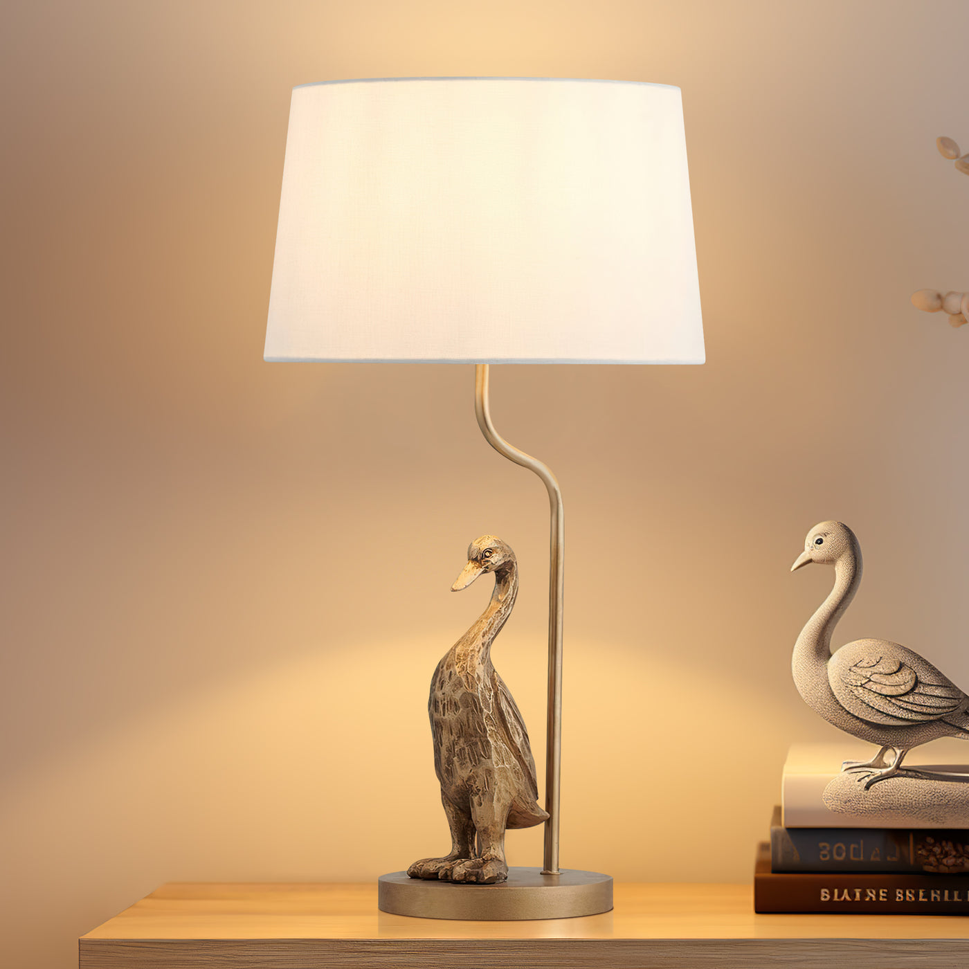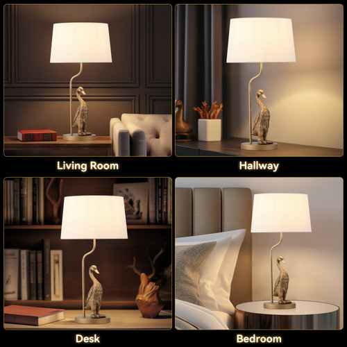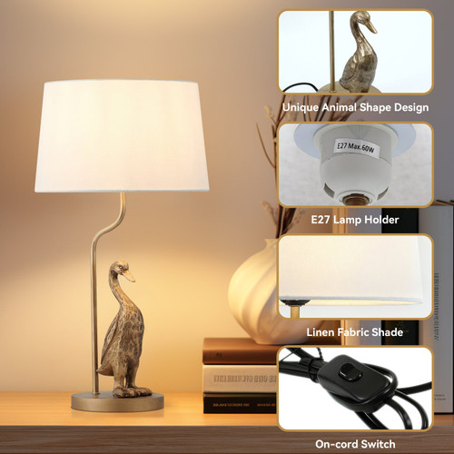 This table lamp is a refined lighting solution that merges artistic charm with durable craftsmanship. Its standout feature is the intricately detailed duck design, crafted from resin and iron with a pewter finish, which adds character and a touch of whimsy to any interior. Paired with a cream fabric shade, this lamp delivers soft, diffused lighting, enhancing its functional elegance. The combination of its unique aesthetic and high-quality materials makes it an ideal choice for both classic and eclectic interior styles.
