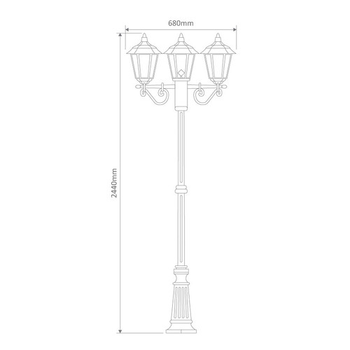 This post light is a colonial-style triple head tall luminaire engineered for dependable exterior illumination, combining Italian manufacture with Australian assembly and powder-coat finishing for enhanced durability. Standing 2440 mm high with an overall width of 680 mm, it delivers a prominent architectural presence suited to pathways, driveways, and landscaped entry zones. The black finish is formulated to provide consistent colour stability and surface protection, presenting a refined appearance while supporting long-term use in outdoor environments.
