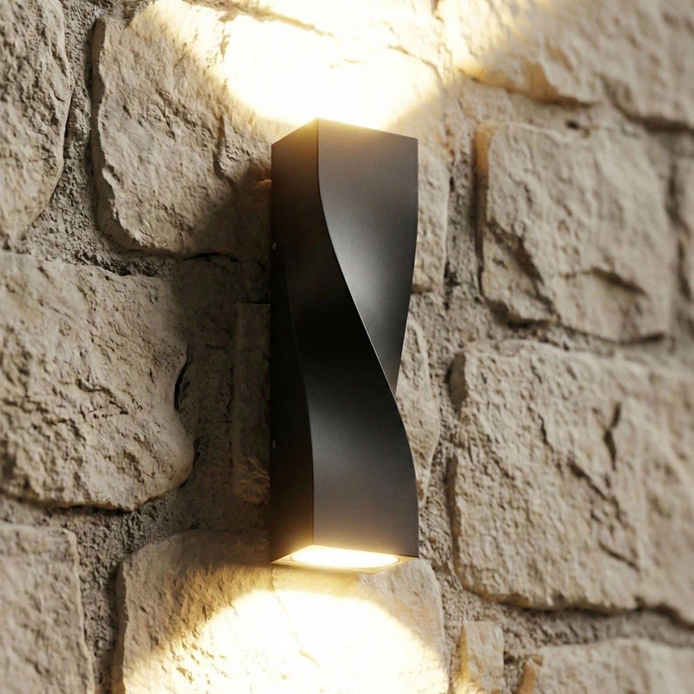 This wall light delivers a refined architectural effect through its twisted dark grey body and bidirectional up/down distribution, providing precise façade and pathway illumination in a compact form factor. Constructed from aluminium with a polycarbonate diffuser, it is engineered for durability and optical stability while maintaining a clean, contemporary appearance. With an overall size of 260 mm in height, 80 mm in width, and 40 mm in depth, it offers a low-profile installation footprint, complemented by a robust back plate measuring 209 mm × 75 mm × 17 mm for secure mounting.
