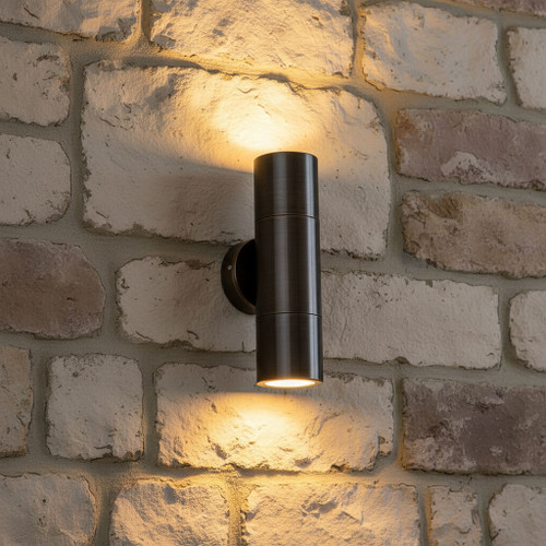 This up down light is a robust exterior lighting fixture engineered to deliver both functional illumination and architectural enhancement in outdoor environments. Constructed from solid brass and finished in an elegant antique brass tone, the fitting offers exceptional resistance to corrosion and environmental degradation, ensuring long-term durability in demanding exterior conditions. Its IP65 rating confirms complete protection against dust ingress and resistance to water jets, making it suitable for installation in exposed outdoor areas such as building facades, entryways, patios, and perimeter walls. The compact cylindrical profile, measuring 210mm in height and 60mm in diameter, provides a refined and contemporary aesthetic while maintaining structural strength.