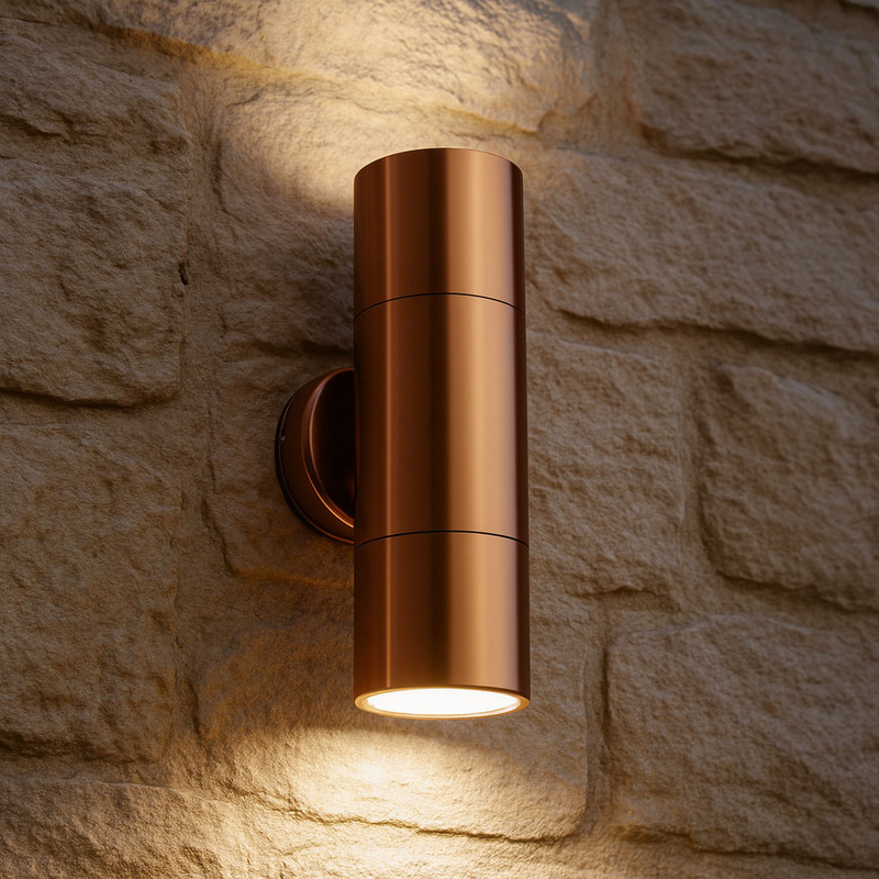 This up down light offers a refined combination of durability, efficiency, and aesthetic appeal, making it an ideal choice for both residential and commercial outdoor applications. Finished in a striking copper tone, it delivers a warm and sophisticated presence that enhances a variety of architectural styles. Its compact cylindrical profile, measuring 210mm in height with a 68mm width and 85mm projection, ensures a balanced form that integrates seamlessly into both traditional and contemporary settings.