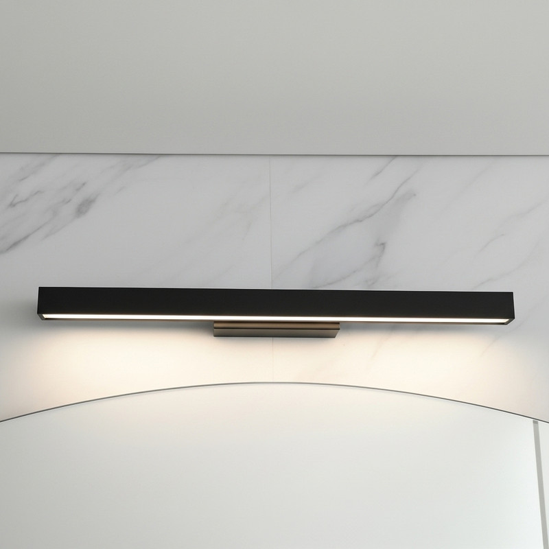 An elegant, clean black LED vanity wall light with opal acrylic lens and 16W LED, ideal for bathrooms and vanity areas.