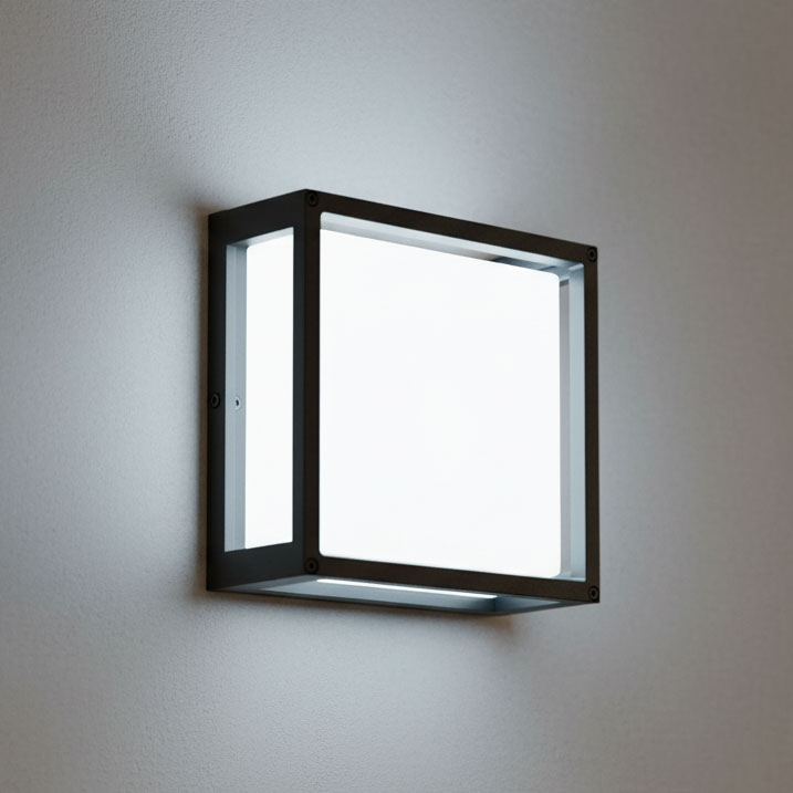 This modern and stylish IP65 wall light offers a flush and compact solution to front facades or back patio areas where ambient lighting is required. It offers a more powerful light output solution at 12W in a large square shape, featuring a dark grey powder-coated aluminium frame, with an opal glass diffuser to give a wide spread of light.