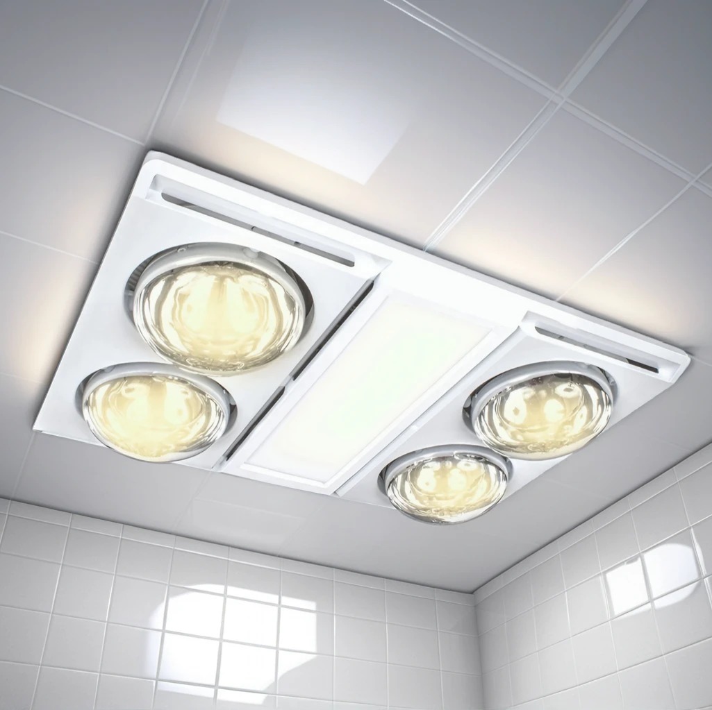 This 3-in-1 bathroom heater fan light was designed to suit medium to large bathrooms with a maximum ceiling height of 2.7m. Warming up your bathrooms with its two heat lamps and allowing air circulation to your bathrooms with its exhaust fan. It has a feature of changing colour temperature. This unit is fitted with a thermostat switch that will automatically turn on the exhaust fan if the internal temperature exceeds 80°C.