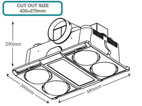 This heater fan is constructed using a durable polypropylene housing and an aluminium fascia with a frosted polycarbonate lens, ensuring both thermal efficiency and longevity. The slimline profile measures 480mm in length, 360mm in width, and 200mm in height, and it requires a 435mm by 275mm ceiling cutout for installation. The side duct outlet measures 120mm in diameter and is compatible with the included 3-metre aluminium ducting (125mm diameter), allowing for effective and flexible venting. The aerodynamic fan design and internal thermal safety switch enhance both airflow performance and safety during operation.