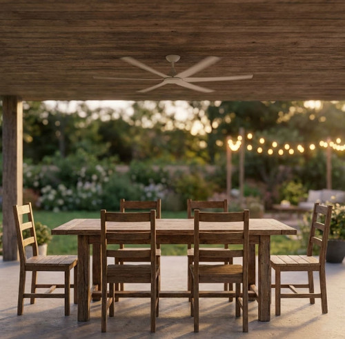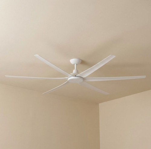 Modern plain white 6 blade ceiling fan with 9 speed function and fan timer and reverse winter/ summer mode included. Made with ABS polymer and tropically rated.