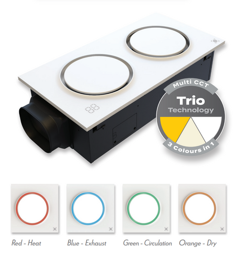 This bathroom heater fan delivers a comprehensive solution for thermal comfort, ventilation, and lighting in residential wet areas. Engineered with a slimline twin circle form factor, the unit integrates six independent functions:heater, exhaust fan, circulating fan, dry heat, ventilation, and illumination. Its 2250W total output is driven by a high-efficiency 75W DC motor, providing powerful yet quiet operation with a noise level of ≤48dB. The 2150W PTC heating element ensures rapid thermal output, while the circulating fan minimises localised heat accumulation and improves ambient distribution across the space.