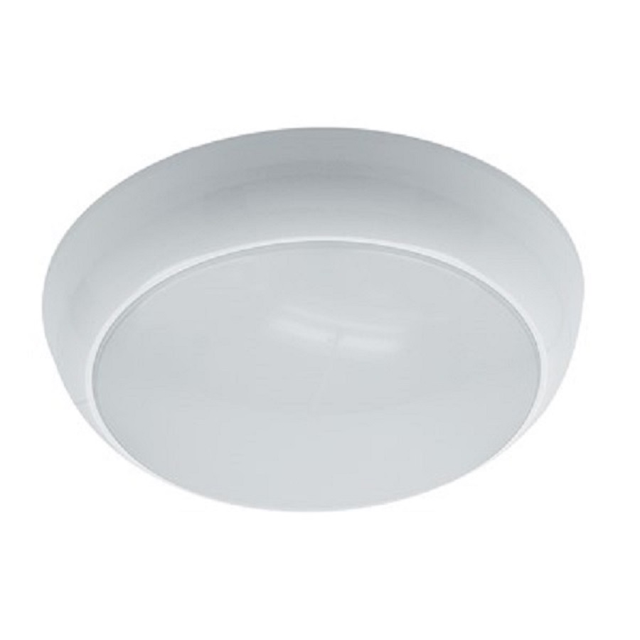 Contemporary oyster light in white trim with an acrylic lens, made from polycarbonate, electronic driver included in the base.